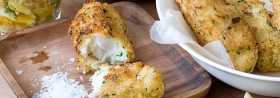 Paluszki rybne z dorsza w panierce z kuskusu z surówką Coleslaw