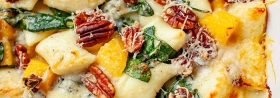 Kopytka zapiekane z dynią, serem pleśniowym i szpinakiem