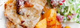 Podawany z ziemniaczkami opiekanymi w aromatycznych przyprawach