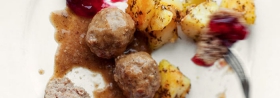 podawane z dżemem borówkowym i chrupiącymi opiekanymi ziemniaczkami