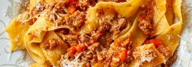 Pasta (papardelle) al ragù - makaron z mięsnym sosem z dodatkiem warzyw (marchewki, selera i cebuli)