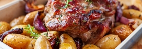 Pieczona karkówka z czerwoną cebulą, suszonymi pomidorami i ziemniakami