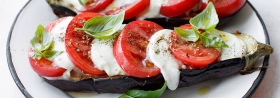 Zapiekane plastry bakłażana z sosem pomidorowym, serem i pomidorami.