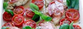 Kurczak w marynacie jogurtowej zapiekany z mozzarellą i pomidorkami