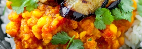 Warzywne curry z cukinią, brokułami, szpinakiem, marchewką i pomidorkami koktajlowymi