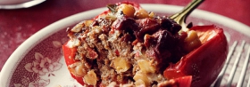 Zapiekane papryki z chili con carne, chorizo i ciecierzycą