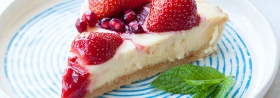 Tarta sernikowa z musem truskawkowym, truskawkami i granatem