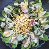 - Kukurydzę odsączyć. Sałatę opłukać i posiekać, włożyć do salaterki lub do pojedynczych miseczek. Doprawić solą i pieprzem, przemieszać.