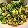 - Ugotować kukurydzę (8 min), brokuły (3 min), oraz makaron soba (5 min). Filety z kurczaka pokroić na 2 cm kawałki, posypać białym pieprzem, dodać starty czosnek, imbir i wymieszać.