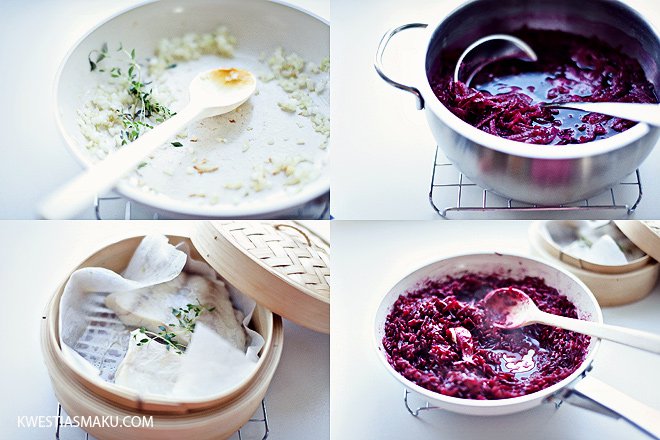 Risotto wegetariańskie z tartymi buraczkami, na bulionie z dodatkiem białego wina i tymiankiem. Na koniec doprawione parmezanem. Podałam je grillowanym kozim serem i tymiankiem, a drugą wersję zrobiłam z filetem ugotowanej na parze ryby. Obydwie były bardzo smaczne. Do risotto (bezpośrednio do bulionu) dodałam też soku z buraków dla wzmocnienia buraczkowego posmaku, ale nie jest on konieczny.