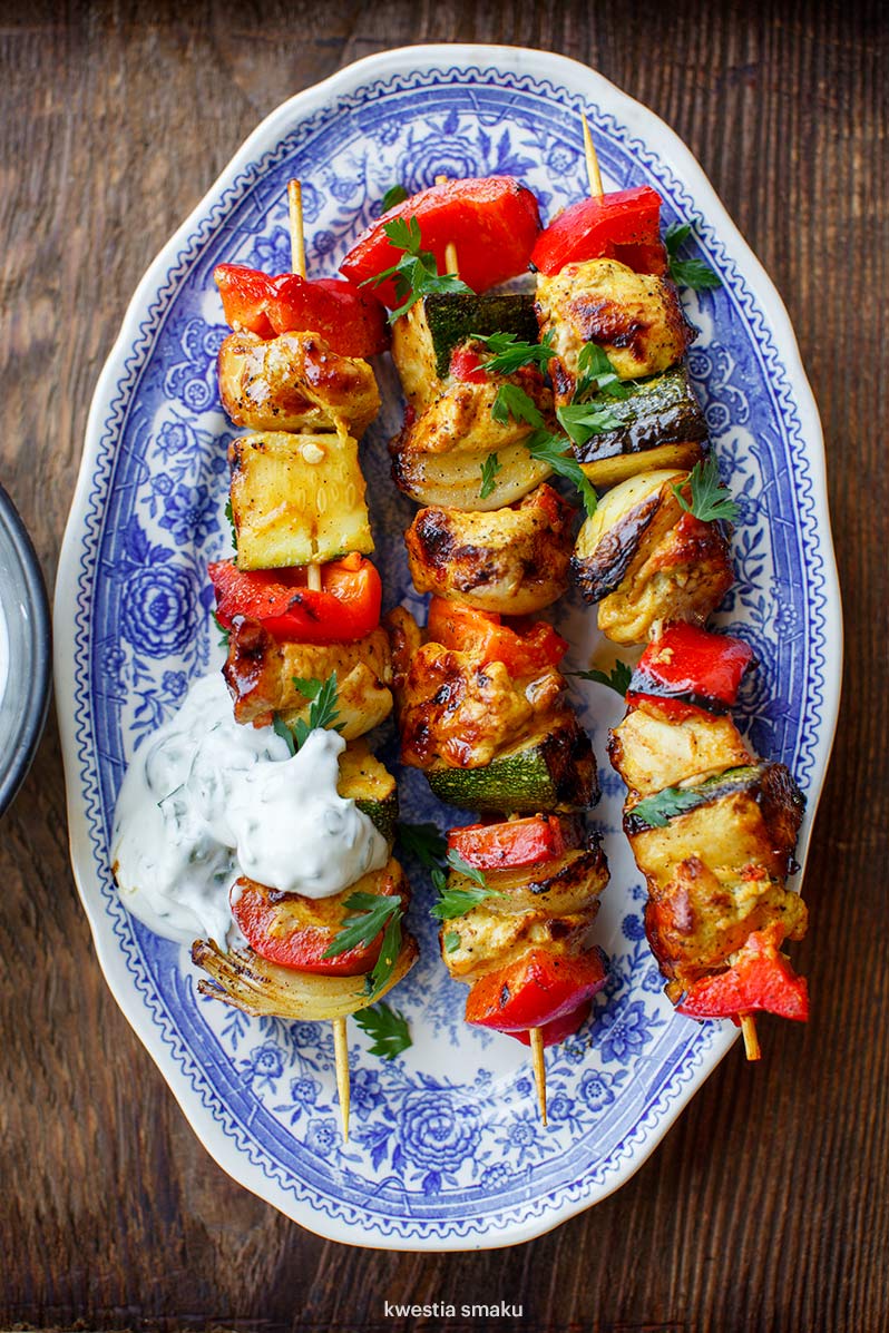 Szaszłyki z kurczakiem i dużą ilością warzyw – cukinią, papryką i młodą cebulką. Wszystkie składniki kroimy na kawałki i w jednym naczyniu mieszamy z oliwą i tą samą mieszanką przypraw składającą się z kurkumy, kolendry, mielonej papryki, chili, kminu rzymskiego oraz – jeśli mamy to polecam – garam masali. Świetnym dodatkiem do takich szaszłyków będzie dip tzatziki z ogórka i jogurtu, czyli jeszcze więcej warzyw! Szaszłyki można zrobić na patelni grillowej jak i grillu ogrodowym.