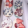 - Do każdej babeczki wcisnąć w środek po dwie czereśniowiśnie (wiśnie, pokrojone czereśnie, maliny, jeżyny lub małe kawałki truskawek) oraz po 5 jagódek (lub borówek). Piec przez ok. 23 minuty.