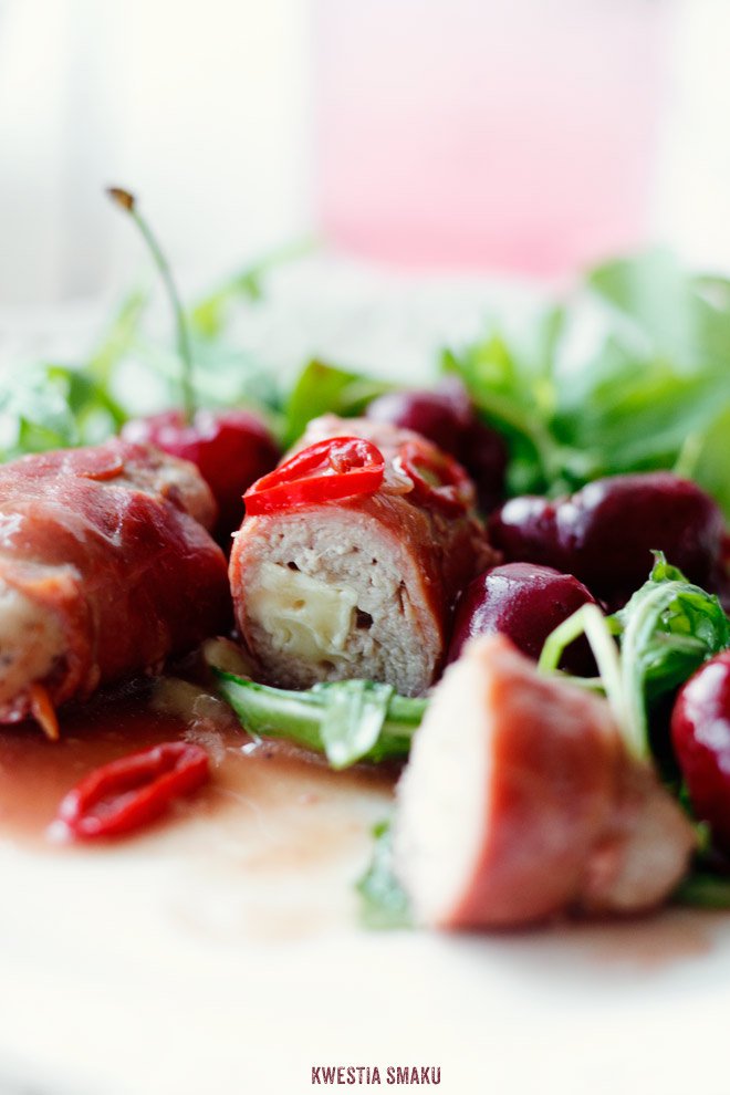Roladki z polędwiczki wieprzowej nadziewane serem camembert i obsmażane w szynce parmeńskiej, podawane z sosem czereśniowym z chili. Szybkie do zrobienia danie z jednej patelni — po podsmażeniu roladek na patelnię wlewamy wymieszane składniki sosu i po zagotowaniu danie jest już gotowe.