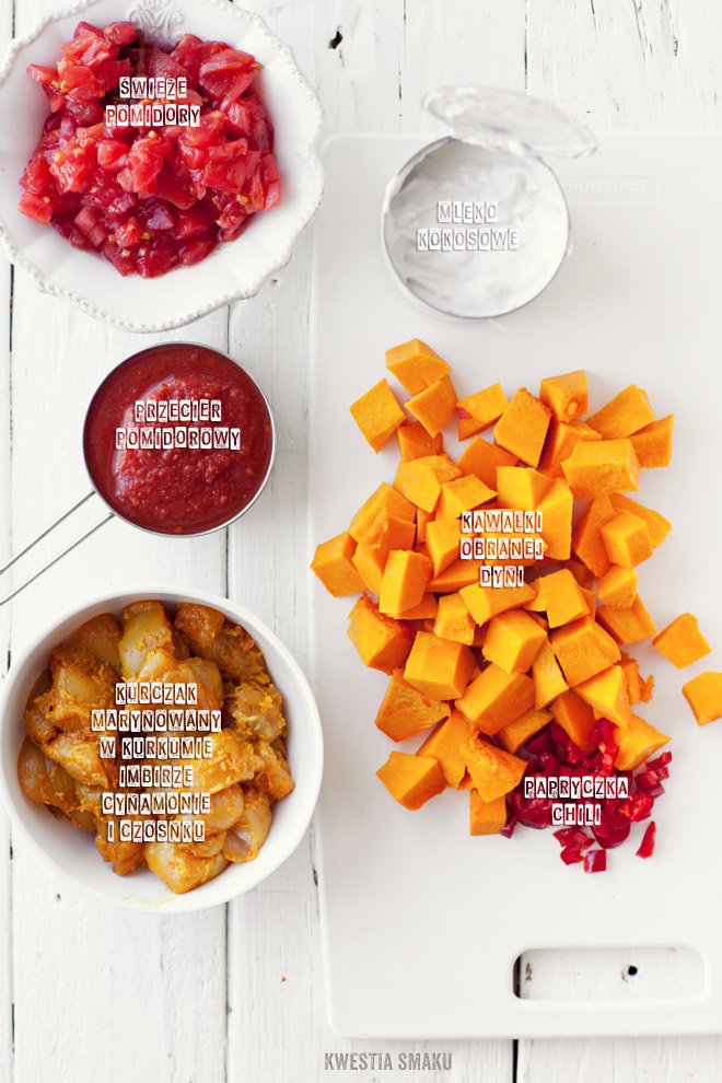 Soczyste piersi kurczaka marynowane w imbirze, czosnku i kurkumie, z odrobiną cynamonu. Podsmażane ze słodką dynią i gotowane w pomidorowym sosie curry z mleczka kokosowego. Podawane z jaśminowym ryżem, ze świeżą chili i posypane kolendrą. Rozgrzewające danie na błyskawiczny obiad, do ugotowania jeszcze dziś :-)