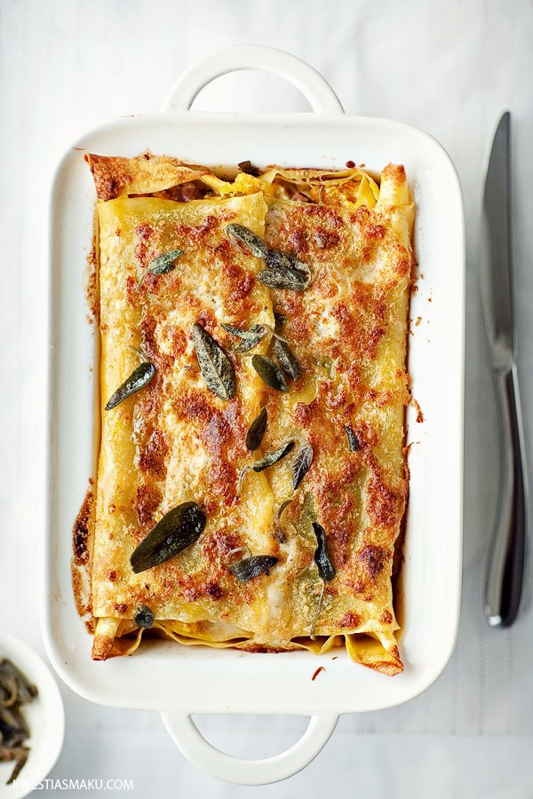 Zapiekanka z płatów ciasta makaronowego przełożonego farszem z pieczonej dyni, sera ricotta, suszonej szynki i chrupiącej szałwii. Przykryta chrupiącą skórką z parmezanu. To klasyczna lasagna, obowiązkowa w sezonie dyniowym :-)