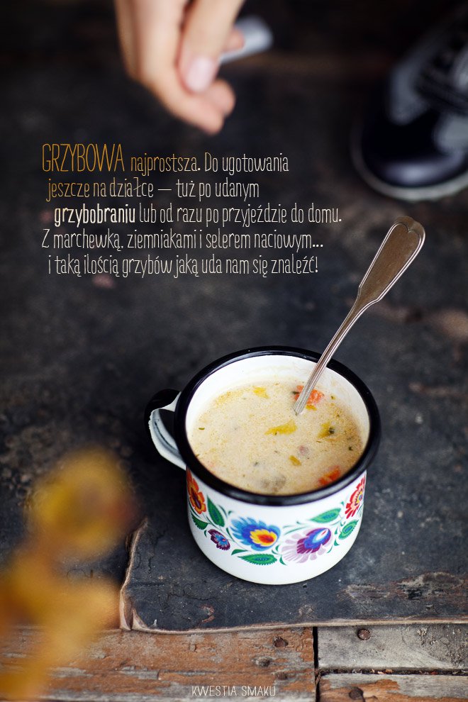 Najprostsza do przygotowania zupa grzybowa dla grzybiarzy — do ugotowania jeszcze na działce lub od razu po przyjeździe do domu po udanym grzybobraniu :-) Można do niej wykorzystać różne, mieszane grzyby, które np. nie nadają się na suszenie. Mogą to być np. podgrzybki, maślaki, kurki. Do zupy dodajemy też warzywa (marchewkę, ziemniaki, selera naciowego), pod koniec — w gotowej już zupie — gotujemy lane kluseczki z dodatkiem tartego sera. Całość podajemy z natką pietruszki i bagietką. Zupę ugotowałam na domowym bulionie drobiowym, polecam wykorzystać do niego wszelkiego rodzaju kawałki mięsa z kostkami (np. korpus, skrzydła, udka). Można też użyć rosołu lub innego uniwersalnego bulionu.