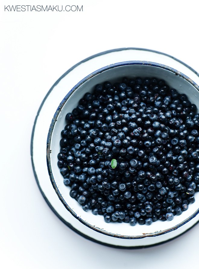 W miniony weekend jedliśmy nasze pierwsze w tym roku świeże jagody. Z syropem klonowym, śmietaną, jogurtem, cukrem z prawdziwą wanilią. Część jagód wykorzystałam do tego ciasta. Spód przygotowałam podobnie jak Brownie (tylko z białą czekoladą zamiast ciemnej), ale z mniejszą ilością masła i czekolady i z dodatkiem proszku do pieczenia. Jest więc bardziej puszysty i wyrośnięty jak biszkopt. Dodatek aromatu cytrynowego ze świeżo startej skórki pomarańczy jest dość intensywny, ale bardzo dobrze komponuje się z czekoladą. Mus z białej czekolady zrobiłam według przepisu na mus z ciemnej czekolady, zamieniłam tylko czekolady i zamiast białek dodałam ubitą śmietanę kremówkę (możecie oczywiście zrobić z białkami).