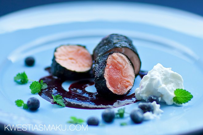 Mąż, gdy zobaczył gotowe danie na talerzu stwierdził, że musiałam się strasznie napracować przy jego przygotowaniu... A ja zrobiłam je w przeciągu pół godziny. Miałam zamrożonego łososia i jagody. Gdzieś na półce, trochę zapomniane, leżały liście alg morskich Sushi Nori, które czekały na swoją okazję... Zwykle w lodówce mam otwarte pudełko mascarpone, a na balkonie świeżą miętę. Danie po prostu przepyszne! Bardzo polecam, np. dla niespodziewanych gości lub na kolację dla kogoś ważnego :-). Mus jagodowy można podać nie tylko do łososia, ale i do polędwiczek, kaczki lub nawet do kurczaka.