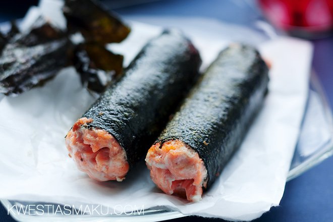 - Łosoś: Filety łososia opłukać, odciąć skórę, wyjąć ości. Jeszcze raz przepłukać i dokładnie osuszyć. Filety pociąć na kawałki o wadze około 125 g każdy, szerokie na mniej więcej 4 cm, grubsze części rozkroić w poprzek. Każdy kawałek oprószyć solą, ścisnąć w rulonik i zawinąć ciasno w listek Sushi Nori (ja zawijałam jeszcze dodatkowo w drugi listek). Przyciąć końce roladki i włożyć na rozgrzaną patelnię. Obsmażyć z każdej strony po około 1 - 2 minuty, aż algi będą chrupiące. Roladki zdjąć z patelni i pokroić na kawałki.