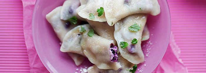 - Ciasto rozwałkować i małą szklanką wycinać kółka, nakładać po małej łyżeczce nadzienia, zlepiać brzegi. Pierogi wrzucać na wrzącą, lekko osoloną wodę i gotować do miękkości, przez około 2 minuty, od czasu ponownego zagotowania się wody. Odsączyć i zaraz podawać posypane brązowym cukrem lub cukrem pudrem i polane słodką śmietanką.