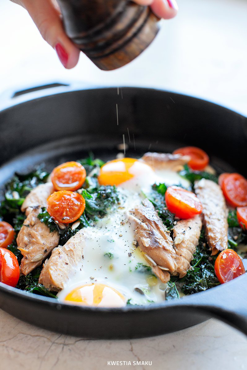 Wykonanie jest proste: zblanszowane (gotowane 2 minuty we wrzątku) liście jarmużu układamy w naczyniu do zapiekania, dodajemy kawałki ryby i pokrojone pomidorki; następnie wbijamy jajka i zapiekamy wszystko w piekarniku przez ok. 10 minut (do ścięcia się białek). Wykorzytujemy też aromatyczną oliwę z puszki i posypujemy mieszanką pestek. Pyszne!
