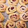 - Na placku rozsypać maliny (mrożonych malin nie trzeba rozmrażać), zwinąć w rulon wzdłuż dłuższego boku i pokroić na 16 plastrów. Ułożyć je na 2 blachach i odstawić na 1/2 godziny do wyrośnięcia (jeśli użyliśmy mrożonych malin dodajmy jeszcze 7-10 minut dłuższego wyrastania).