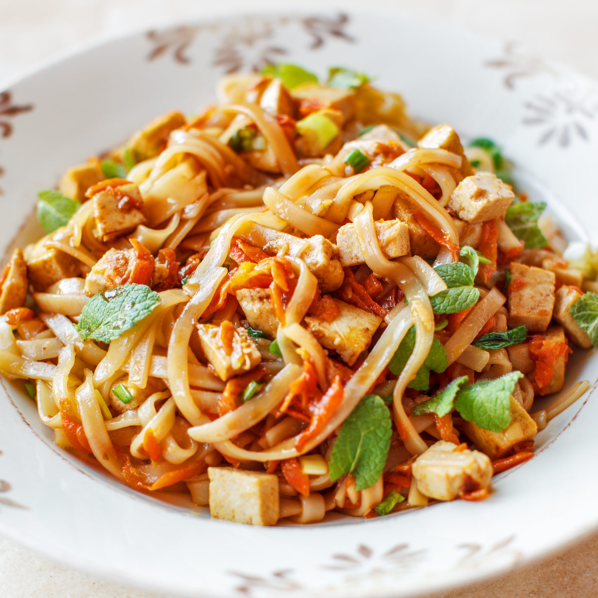 Smażony makaron z marchewką, imbirem i tofu