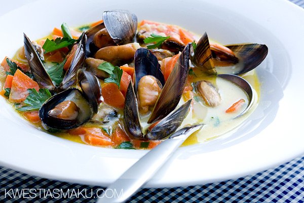 Małże z mnóstwem glazurowanej marchewki, w bulionie ze śmietanką i natką pietruszki. Już podczas degustacji potrawy stwierdziłam, że świetnie pasowałaby tu śmietanka kokosowa zamiast śmietanki kremówki, starty imbir (dodany w tym samym momencie co cebulka) i świeża papryczka chili... Ale to byłaby już inna zupa :-)