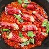 Kolejna propozycja na pyszny i szybki obiad z jednej patelni. Piersi kurczaka najpierw podsmażam w szynce parmeńskiej. Mięso zdejmuję i na tej samej patelni robię błyskawiczny sos pomidorowy ze świeżych, malinowych pomidorów. Taki sos robię też często do makaronu. Ważną zasadą w jego przygotowaniu jest smażenie pomidorów krótko, na wysokim ogniu i bez mieszania. Wówczas pomidory nie rozpadają się i są jędrne, nie tracą za dużo wody, a wyciekający z nich sok szybko redukuje się i gęstnieje. W połączeniu z masłem i oliwą tworzy się pyszny sos o konsystencji emulsji.
