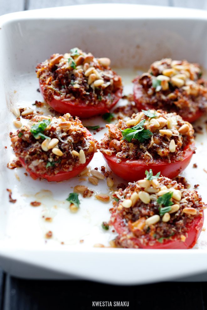 - Połówki pomidorów ułożyć w naczyniu żaroodpornym, napełnić farszem (docisnąć i uklepać), posypać odłożonym serem i wstawić do piekarnika. Piec przez 25 minut, następnie posypać orzeszkami pinii i zapiekać jeszcze przez 5 minut.