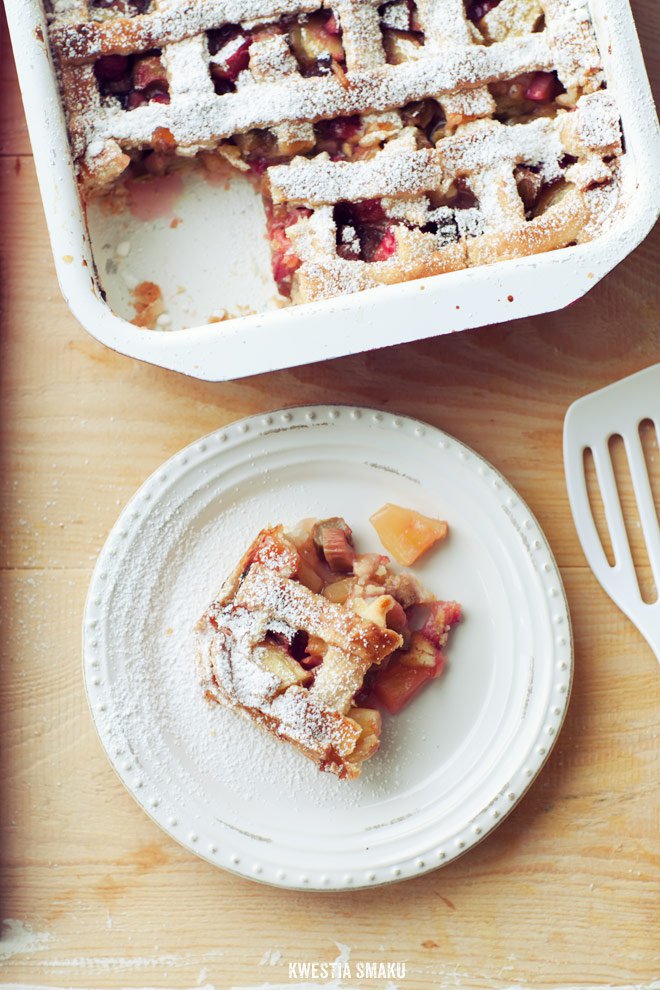 Pyszne ciasto z dużą ilością nadzienia z rabarbaru i świeżego ananasa. Z dodatkiem daktyli (lub rodzynek) oraz pasty waniliowej. Deser dość łatwo się przygotowuje — samego ciasta nie trzeba wcześniej podpiekać i można szybko zagnieść przy pomocy miksera. Nie dodaje się do niego jajek. Ciasto po upieczeniu pięknie pachnie i wybornie (i bardzo wiosennie) smakuje. Świetny deser na weekendowe piknikowanie :-)
