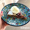 Gałka lodów waniliowych lub śmietankowych położona na jeszcze ciepłym kawałku ciasta.