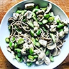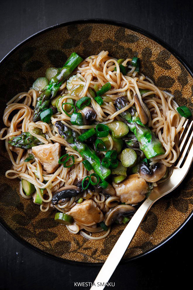 Makaron z woka z kurczakiem, szparagami i pieczarkami