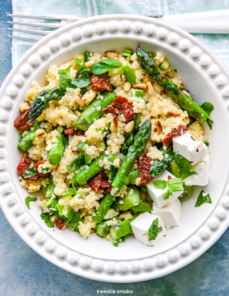 Kasza jaglana ze szparagami, suszonymi pomidorami i fetą