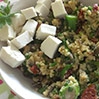 • Do kaszy dodać resztę składników: pokrojone suszone pomidory, posiekany szczypiorek, miętę, lekko zrumienione na patelni orzeszki pinii, wszystko skropić sokiem z cytryny i resztą oleju lub oliwy, doprawić solą i świeżo zmielonym czarnym pieprzem, wymieszać i posypać fetą. Można dodać więcej aromatycznej oliwy.