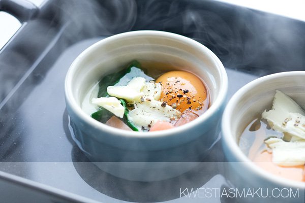 - Foremki ustawić w żaroodpornym naczyniu i wlać do niego tyle wrzącej wody, aby sięgała do połowy wysokości foremek. Wstawić do nagrzanego piekarnika i zapiekać przez 10 - 12 minut, aż białka się zetną, ale żółtka pozostaną płynne. Podawać z pieczywem, najlepiej opieczonym w tosterze i posmarowanym masłem.