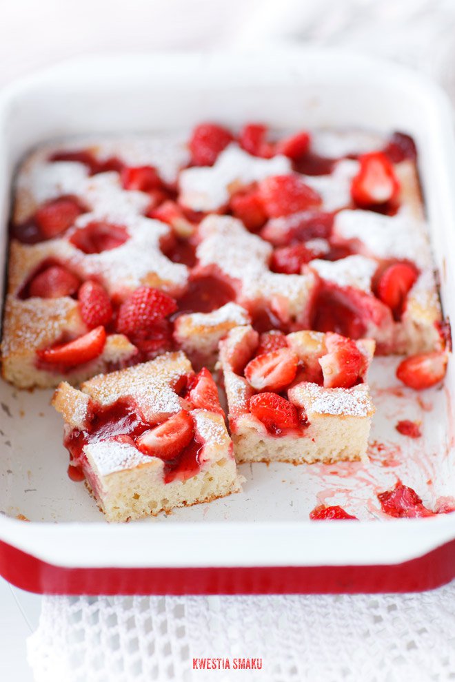- Masę wyłożyć równomiernie do przygotowanej tortownicy. Truskawki wymieszane z kisielem wyłożyć na powierzchni ciasta zachowując odstępy. Wstawić do nagrzanego piekarnika i piec przez 27-30 minut, do czasu aż ciasto urośnie, a wierzch się lekko zrumieni. Po podanym czasie pieczenia brzegi ciasta powinny odchodzić od tortownicy a wetknięty patyczek nie powinien być obklejony surowym ciastem.