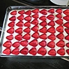 - Na wierzch ułożyć połówki truskawek (jeśli masa jest za rzadka aby utrzymać truskawki - co nie powinno się zdarzyć - deser można wstawić do lodówki i odczekać kilka lub kilkanaście minut aż nieco zgęstnieje). Gotowy deser wstawić do lodówki do całkowitego zastygnięcia (na około 4 - 5 godzin lub najlepiej na całą noc).