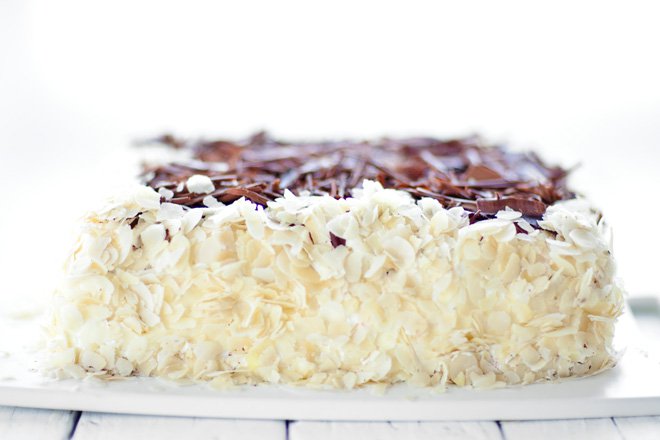 Tort śmietankowy z kawałkami czekolady i płatkami migdałów. Prosty, szybki do przygotowania i przepyszny!